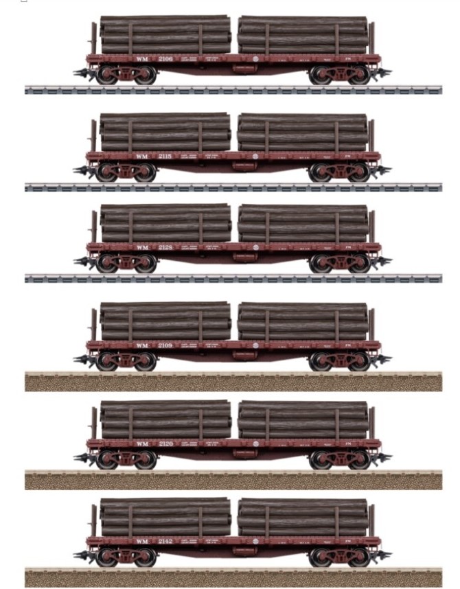 Passend zur Lokomotive gibt es zwei Sets (Märklin/TRIX) aus jeweils drei neu konstruierten Holztransportwagen. Die Wagen sind jeweils mit zwei Holzstapeln (Kunststoff) beladen. Die Ladung kann mittels im Ladegut befindlichen Magneten auf den Wagen fixiert werden. Die Rungen sind abnehmbar und die Wagen sind fein detailliert. Die Wagen besitzen Märklin-Kurzkupplungen in NEM-Aufnahmen.