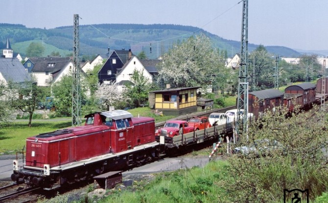 Bild oben: Ein super Motiv für die Modellbahn! Die V90 040 zieht eine Übergabe aus dem Bahnhof Kreuztal. Direkt hinter der Lok ein Flachwagen mit PKW die wohl für den Schrottplatz bestimmt sind... Copyright: Wolfgang Bügel / Slg. Eisenbahnstiftung